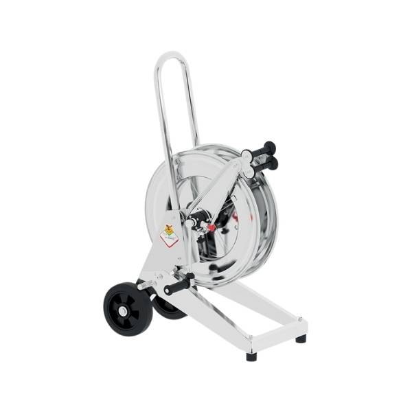 Manual Trolley-Mounted Hose Reel in AISI 304 Stainless Steel Series 530, for Hot Water, 400 Bar, Without Hose. Inlet G 3/8" (F), Outlet G 1/2" (F). Hose Guide, Safety System and Rotation Lock as Standard